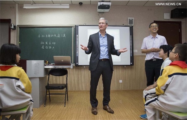 L’amministratore delegato di Apple ha ricevuto spiegazioni sul funzionamento del programma educazionale e si è fatto poi fotografare con studenti e insegnanti. Lo stesso giorno Cook ha incontrato la vice premier Liu Yandong e questa ha lodato la Mela per “lo sviluppo imprenditoriale in Cina, la sua attiva cooperazione con la Cina nella scienza, tecnologia, formazione e altri campi”, invitandolo a investire ancora nel paese.