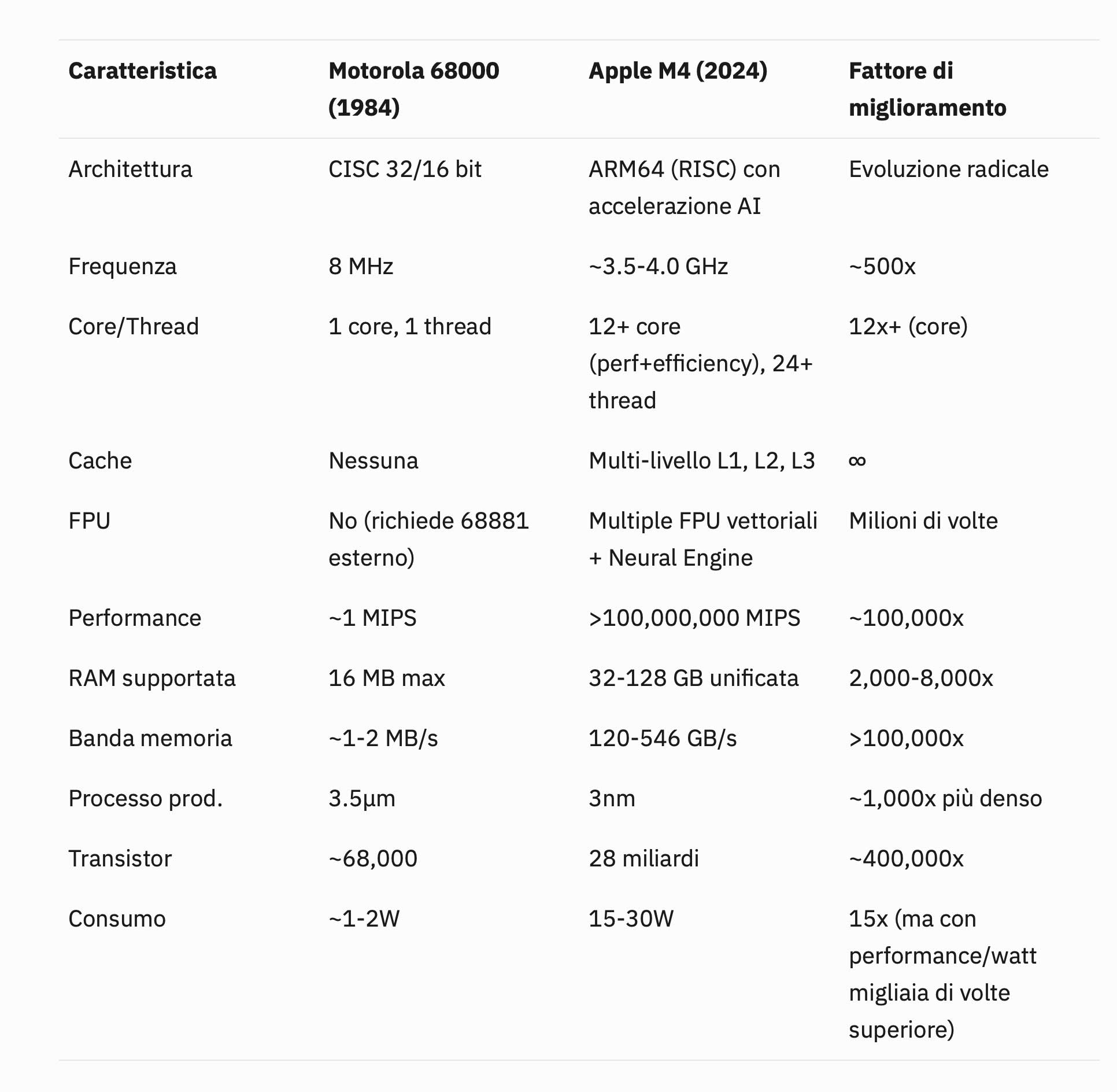 Non è finita. Il vecchio processore consumava circa 2 Watt di energia, l’M4 ne usa 15-30, ma la differenza di efficienza è astronomica. Per fare un calcolo complesso il 68000 avrebbe consumato più energia di quanta ne serve all’M4 per elaborare un intero film. Il processore del 1984 poteva eseguire circa un milione di istruzioni al secondo (MIPS), l’M4 supera i 100 miliardi: è come confrontare il tempo che ci mette una lumaca ad attraversare un giardino con quello di un razzo per fare il giro della Terra.