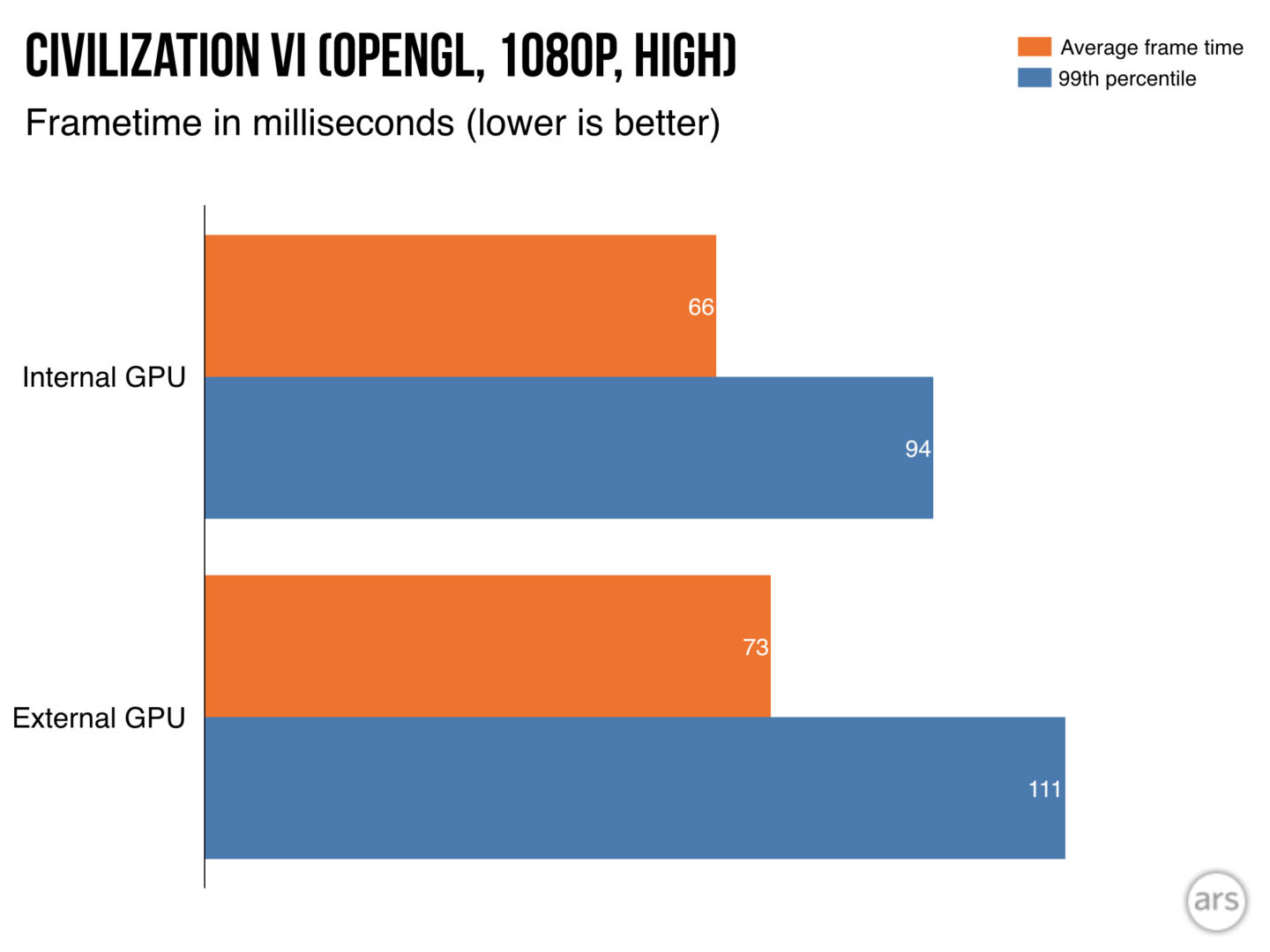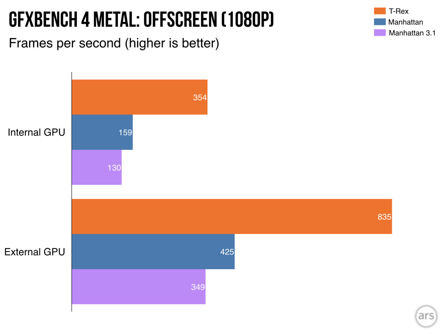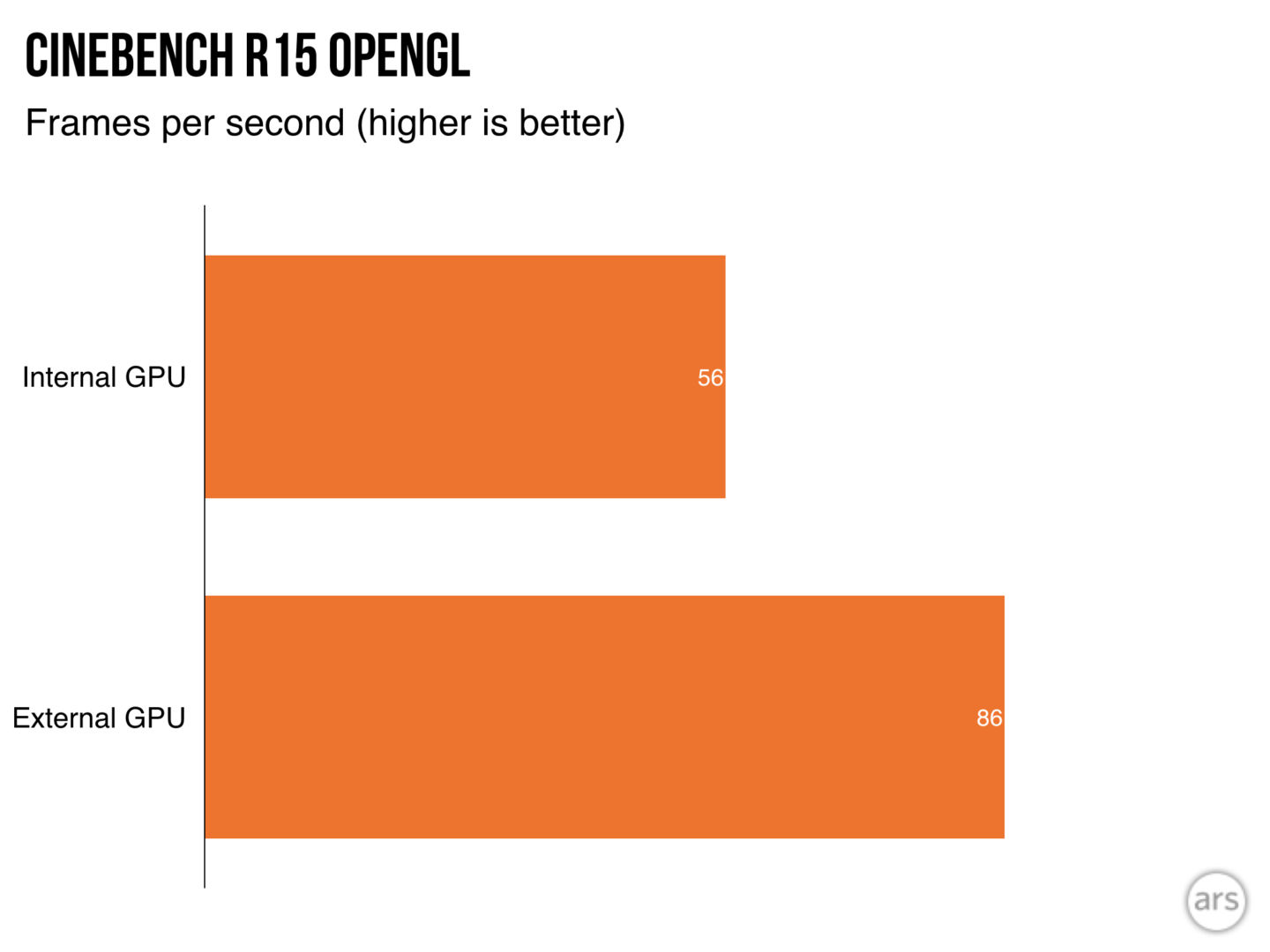 Il MacBook Pro top di gamma fine 2016 con Radeon Pro 460 confrontato con la eGPU AMD Radeon RX 580 installata all’interno di un box Sonnet eGFX Breakaway da 350W, evidenzia velocità doppia con applicazioni che sfruttano la tecnologia Metal. I test OpenGL evidenziano incrementi di velocità variabili tra il 20% e il 75% a seconda dei software. Le eGPU potrebbero essere di particolare interesse per chi sfrutta applicazioni di modellazione 3D o giochi che richiedono processori grafici avanzati.