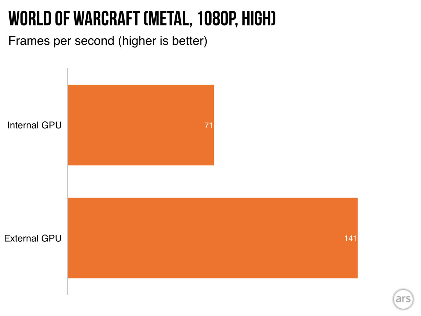 Bisognerà ad ogni modo attendere che i vari sviluppatori tengano conto di questa possibilità. Con alcuni giochi, ad esempio, non vi è differenza e l’impressione generale, scrive il redattore di Ars è che tutto sia ancora allo stato embrionale. Le potenzialità ci sono ad ogni modo tutte, ma al momento l’acquisto di questi box è consigliato solo a chi ha la certezza che il software usato verrà effettivamente accelerato. Tra i software che è potenzialmente possibile accelerare: applicazioni professionali progettate per utilizzare più GPU, Giochi in 3D (collegando un monitor esterno direttamente alla eGPU), applicazioni VR (collegando il visore VR direttamente alla eGPU) e anche giochi 3D in grado di tenere conto del display integrato di un iMac o MacBook Pro (funzionalità di cui deve tenere conto lo sviluppatore dell’applicazione).