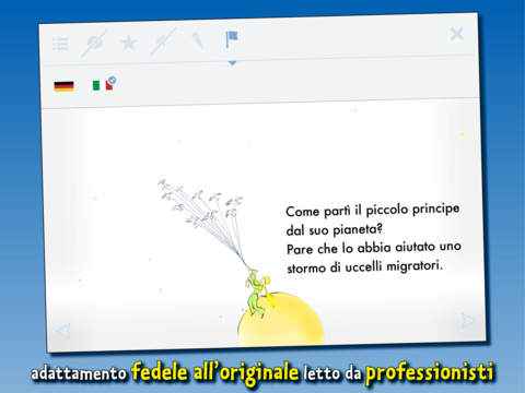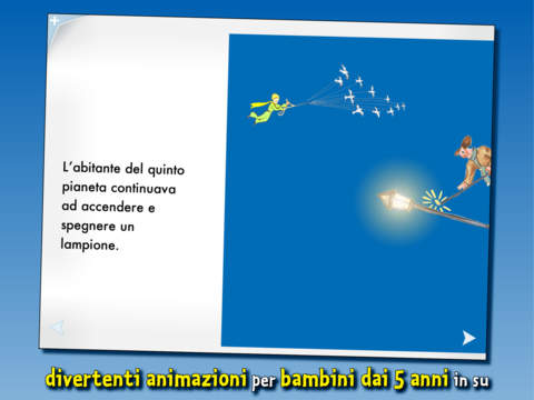 Le mamme e i papà che leggeranno il libro su iPad e iPhone ai propri bimbi, e che conoscono la favola dell’autore francese, si accorgeranno della fedeltà che gli autori di Larixpress hanno mantenuto rispetto all’opera originale: dalle illustrazioni, al testo adattato ai più piccoli, all’atmosfera regalata da musica e animazioni: tutto è perfettamente in linea con il capolavoro di Saint-Exupery. In cinque capitoli e 34 scene diverse con altrettante animazioni, ma con un linguaggio semplice, i lettori si troveranno immersi in una versione moderna animata ma sempre piena di poesia della storia del ragazzino dai capelli d’oro, del suo desiderio di avventura, della sua curiosità, della scoperta dell’amicizia.