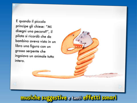 I lettori ascolteranno le vicende del Piccolo Principe, e saranno con lui quando partirà dal suo pianeta con gli uccelli migratori, quando innaffierà la sua rosa, quando faranno capolino nella sua vita dei nuovi amici, quando farà esperienza dell’amicizia, dell’addio e di tante altre emozioni. Saranno con lui anche perché facendo tap sullo schermo i bimbi contribuiranno a dare vita alle scene: faranno tramontare il sole, metteranno il paravento intorno alla rosa, guarderanno attraverso il binocolo, permetteranno agli abitanti dei diversi pianeti di materializzarsi e di dire la propria.
