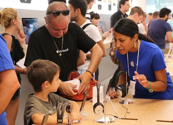 E’ cambiato anche l’atteggiamento di chi fornisce assistenza: ora non c’è piu un desk specializzato per il genius a ridosso della parete di fondo ma un enorme banco open space che serve a mantenere “liquido” il rapporto con l’utente finale sempre più svincolato dalla presa di corrente, da quella di rete, dal concetto di dipendenza da una scrivania.