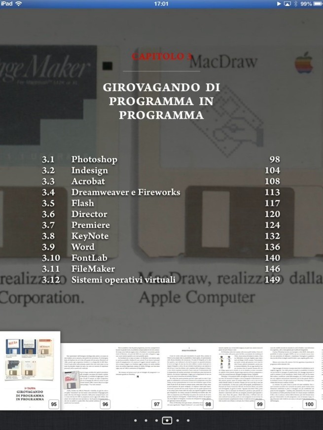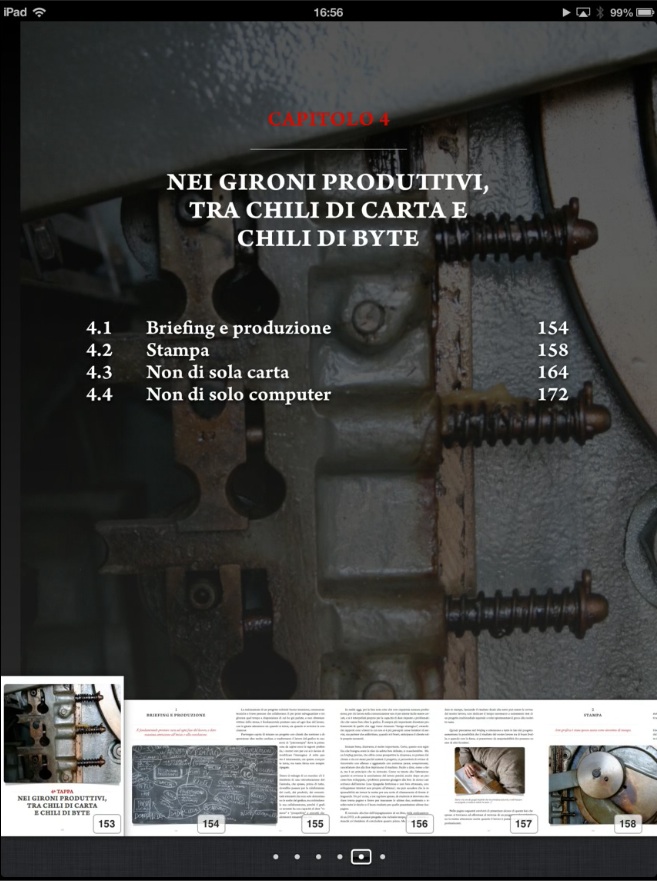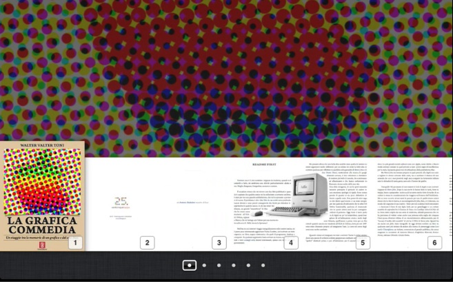 Il libro è inanzitutto un’ottimo esempio di come si impagina un testo in iBooks Author e di come si possono sfruttare con abilità le caratteristiche di animazione e composizione della pagina e delle immagini a corredo: “ovvio” – dirà il lettore – ” questo signore ha studiato e poi insegnato per tanti anni all’ISIA di Urbino” ed è a capo di un affermato studio grafico…”. E’ proprio per questo che dalla lettura traspare non solo la conoscenza degli strumenti e la capacità di racconto ma anche e soprattutto l’amore per il proprio lavoro e in qualche modo la nostalgia per un periodo che lo ha visto a contatto con tanti studenti che ha visto crescere e trasformarsi in professionisti e artisti.