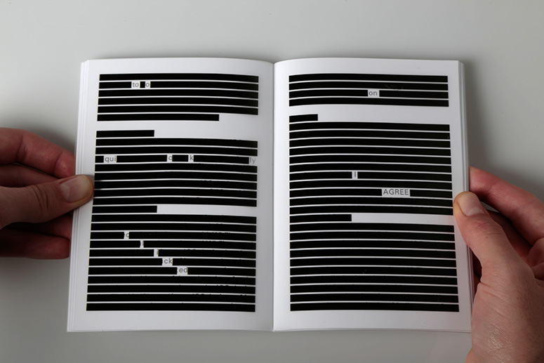 Nessuno probabilmente legge i termini e le condizioni di licenza (i contratti che regolano l’uso di un software); quando qualche servizio o programma li mostra, sono generalmente sempre accettati o letti distrattamente. L’artista Florence Meunie ha stampato i termini e le condizioni d’uso di iCloud ed è riuscito a ricavare dal contratto una storia sbirciando tra le righe, nascondendo alcune parti del testo ed evidenziandone altre. Il racconto è intitolato “The Man who Agreed” e prende un po’ in giro ma non troppo il “legalese” (il gergo usato dagli avvocati per redigere alcuni documenti) usato nel contratto.