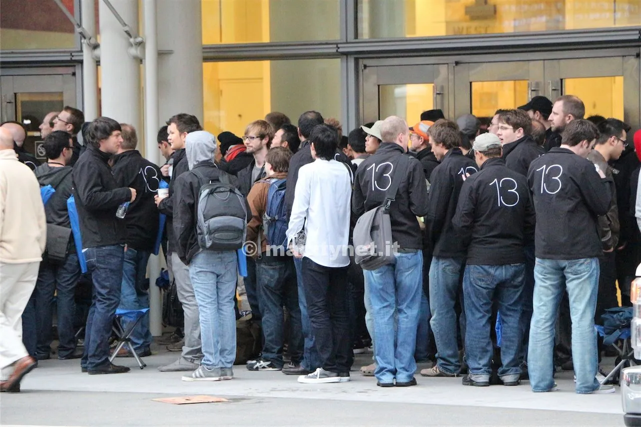 Sono migliaia gli sviluppatori in fila da stanotte per entrare al Keynote che inaugura la WWDC 2013 e la fila si allunga sempre più. La testimonianza di quel che sta accadendo intorno al Moscone è in questa galleria che vi offriamo, direttamente da San Francisco. Il nostro team è sul posto dalle 5 di stamattina e come si può notare ora alle prime luci dell’alba c’è grande fermento.