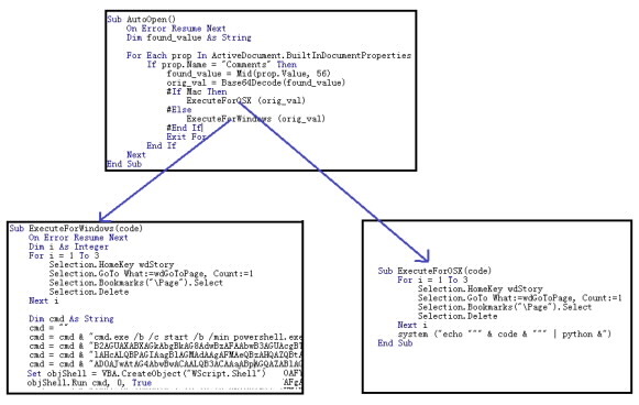 Eseguendo la macro, spiega Appleinsider, viene letto, decodificato ed eseguito un codice memorizzato con codifica Base64 (una tecnica di conversione dei dati basata su 64 simboli del formato ASCII). Il codice è uno script python che cerca di identificare il sistema operativo sul quale sta girando, esegue due diverse funzioni in base al sistema host individuato: macOS o Windows.