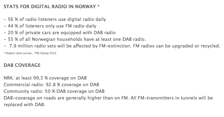 La Norvegia, dunque, sarà il primo paese al mondo a eseguire lo switch off delle trasmissioni FM, una transizione che è in preparazione dal 1995. Negli ultimi due anni varie emittenti nazionali e locali sono passate alla trasmissione in codifica digitale, con vantaggi e svantaggi rispetto a quella analogica. Secondo un sondaggio di Digitalradio elaborato da TNS Gallup, sembra ad che il 56% degli ascoltatori del paese usi quotidianamente la radio digitale e nel 55% delle case via sia almeno un apparecchio moderno in grado di consentire l’ascolto delle radio DAB.