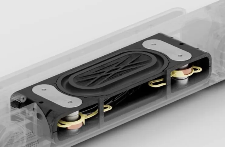 Ma come funziona il woofer della nuova soundbar?  Innanzitutto è collocato in una posizione asimmetrica rispetto agli altri speaker e questo perché le basse frequenze hanno una bassissima direzionalità e in più, grazie alla doppia membrana non ci sono movimenti o vibrazioni spurie che potrebbero sbilanciare il dispositivo.
