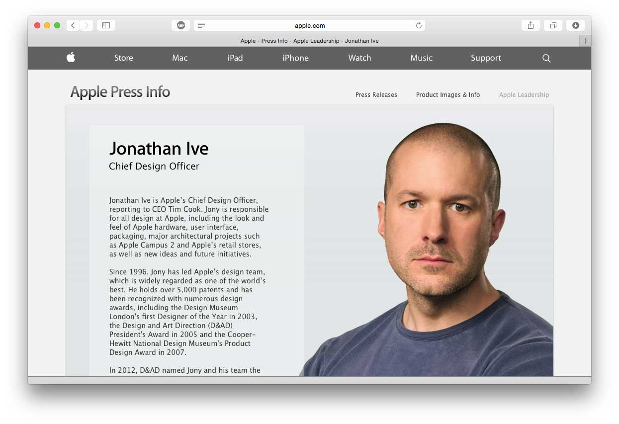 Apple ha in qualche modo ufficializzato la nuova qualifica di Jonathan Ive, specificando meglio il ruolo nella sezione della pagina web dedicata ai vari dirigenti, aggiungendo inoltre dettagli con i profili di Alan Dye e Richard Howarth.