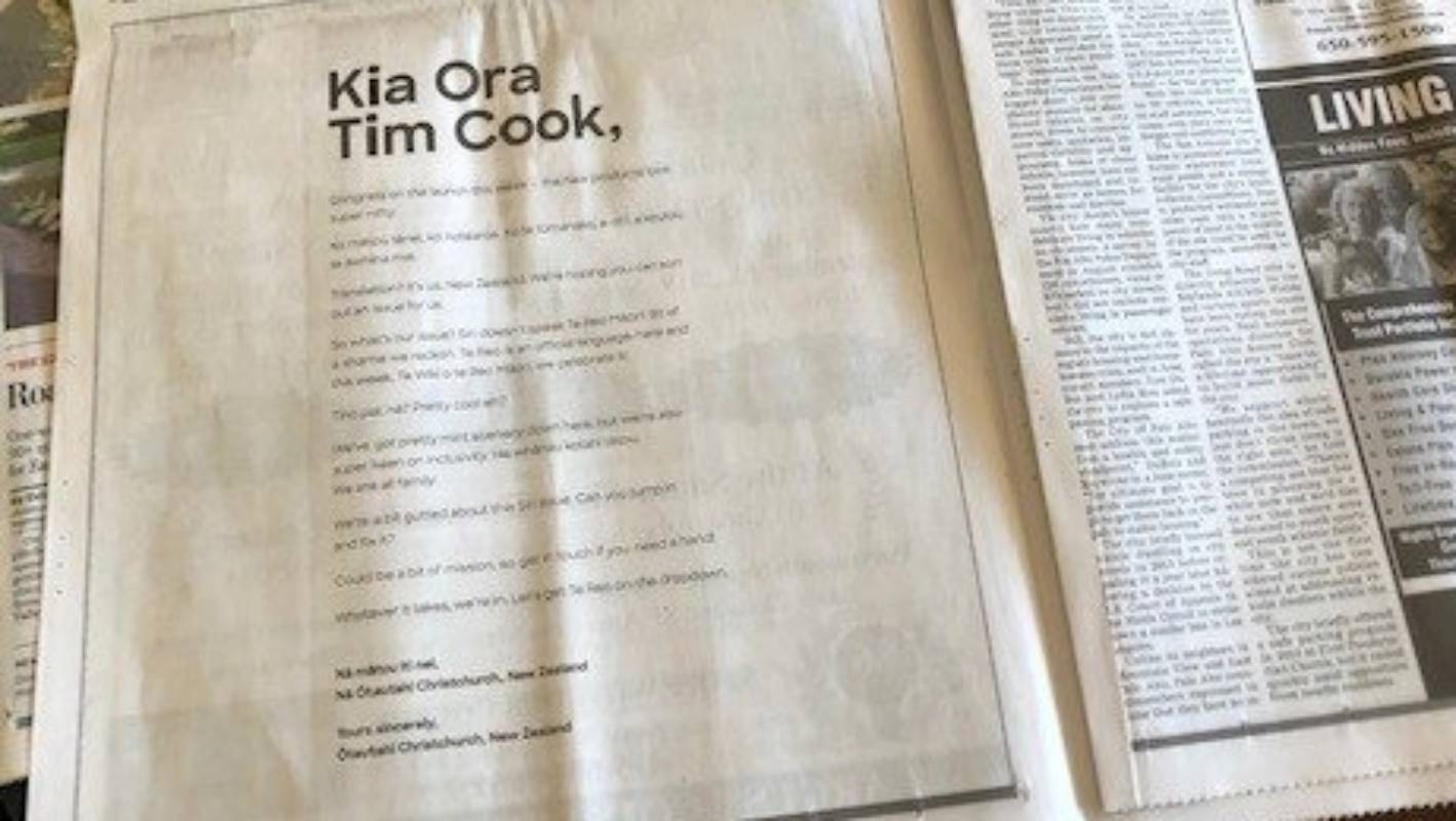 La lettera riporta un testo indirizzato al CEO di Apple, Tim Cook, scritto sia in Māori, sia in inglese. Si parte con i complimenti di rito all’azienda per i suoi computer e i suoi nuovi “eleganti” telefoni da poco presentati per arrivare alla fine a chiedere all’amministratore delegato della Mela di risolvere “quello che per noi è un problema”.