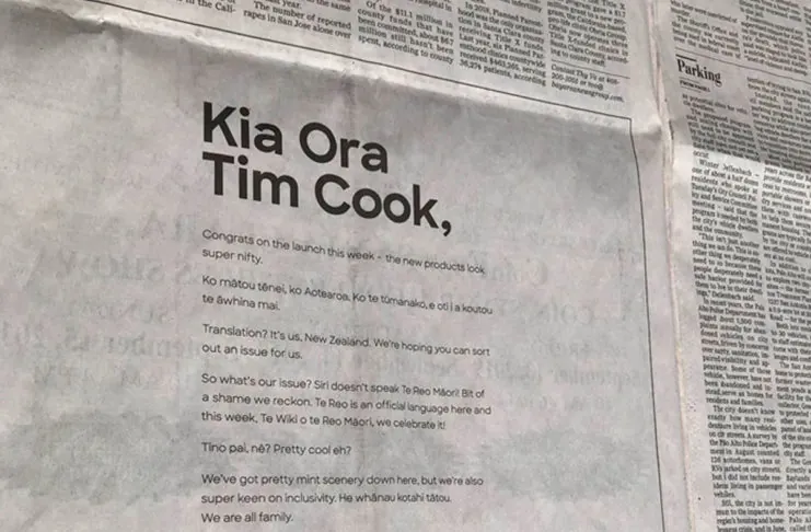 La richiesta è stata fatta con un annuncio su un giornale statunitense. Nell’annuncio a pagamento (4500$) su un quotidiano californiano, si chiede ad Apple di insegnare all’assistente vocale Siri il māori, elemento che potrebbe essere nien’taltro che un’astuta mossa pubblicitaria per promuovere Christchurch.