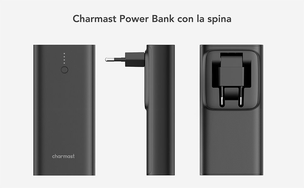 Questo accessorio, prodotto da un leader nel settore della batterie esterne, è molto originale. La peculiarità quasi se non del tutto unica è quella di integrare una batteria da 10000 mAh con un caricabatterie. In pratica nonostante abbia la classica porta USB-C bidirezionale (carica e ricarica) l’alimentatore per ricaricarla non è indispensabile: potete infatti collegare la spina integrata dentro alla batteria stessa ad una presa. Non solo, quindi, non serve il caricabatterie ma neppure un cavo.