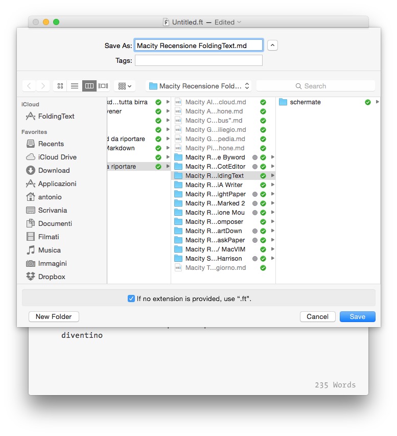 Un’altra caratteristica del software è che salva nel formato “.ft”, anche se accetta ovviamente la modifica dell’estensione in qualsiasi modo si voglia. Questo perché l’estensione in qualche modo, secondo l’autore, dovrebbe servire a dichiarare meglio il tipo di struttura del Markdown utilizzato. Il linguaggio di marcatura leggera non ha uno standard unico ben definito ma un certo numero di dialetti (circa una ventina) alcuni dei quali utilizzano dichiarazioni nel testo del documento (all’inizio o alla fine, tipicamente). La scelta di FoldingText è intelligente ma al tempo stesso pericolosa. Consente infatti di distinguere bene senza problemi o rischi di “sbavature” (righe spurie che rimangono nel rendering di un documento perché quel particolare interprete non sa come gestirle) ma al tempo stesso limita un po’ la compatibilità soprattutto con alcuni editor su iOS, che aprono solo cose con estensione “.txt” e “.md”.