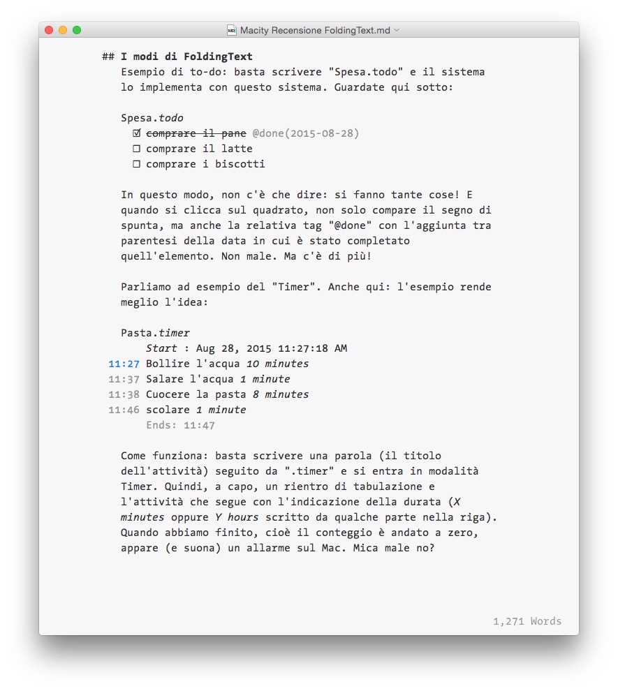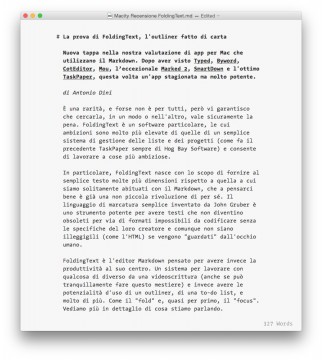 FoldingText è un notevole pezzo di software. Si basa sul testo semplice, utilizza il Markdown con una variante che consente di fare ben più che non semplice videoscrittura. È infatti possibile utilizzarlo per liste, to-do, outline, ma anche per funzionalità avanzate (timer, checklist e via dicendo). In più, la possibilità di utilizzare le tag e una funzionalità di ricerca avanzata basata su espressioni regolari, oltre a una architettura a plugin e alla compatibilità con AppleScript, lo rende uno strumento davvero potente.