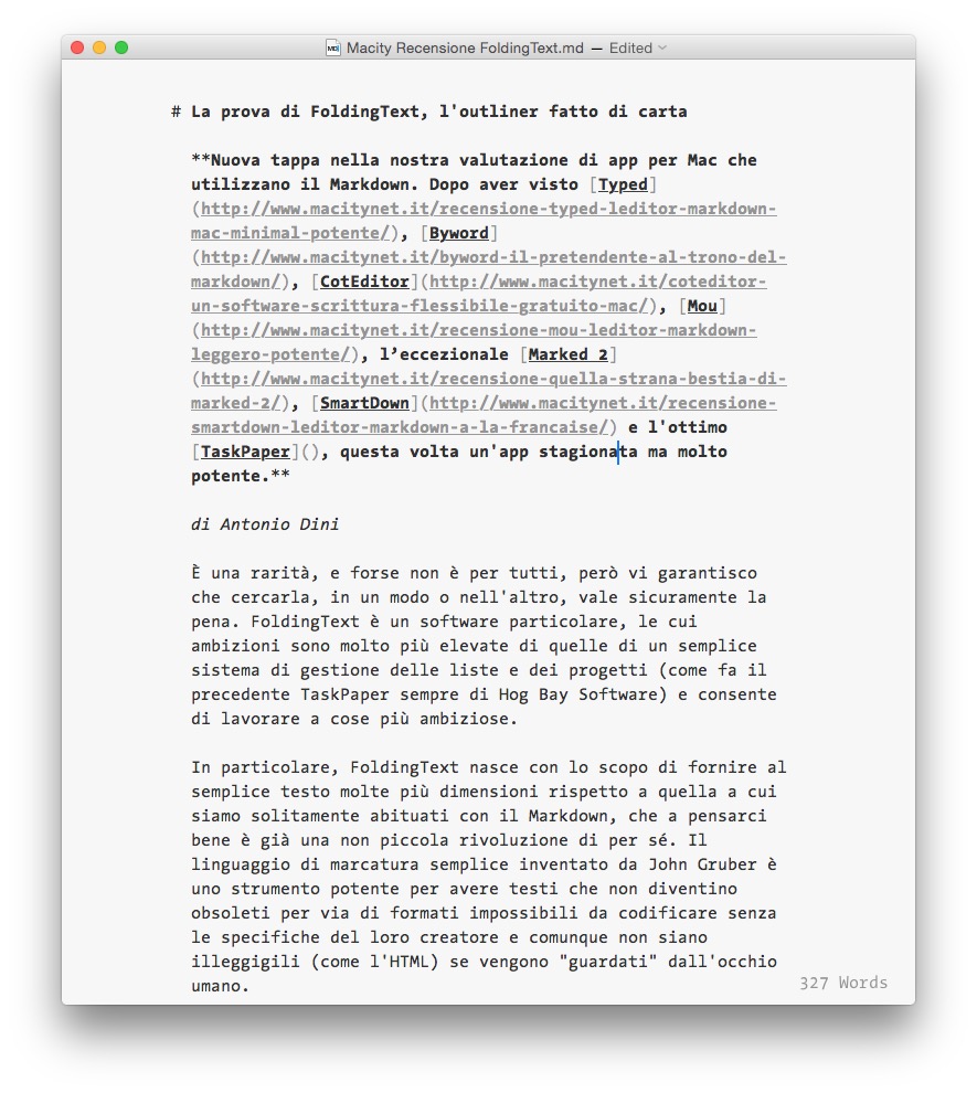 La prima cosa dell’approccio al Markdown che si nota con FoldingText è l’eleganza. I documenti MD aperti in questo editor vengono renderizzati e nascondono la sintassi (asterischi, trattini bassi, struttura dei link e via dicendo). Se però si va sopra con il cursore ad esempio a un link, ecco che viene rivelata la struttura del link (piuttosto complicata ma piacevole come sempre).