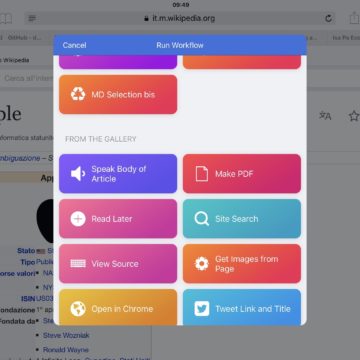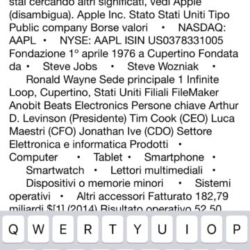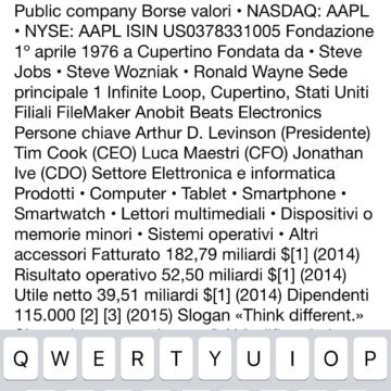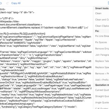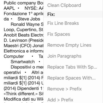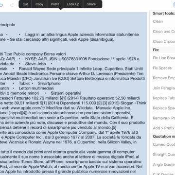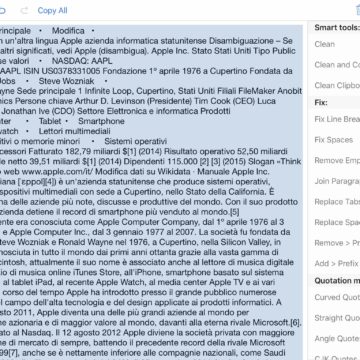 Abbiamo fatto un esperimento: da Safari abbiamo selezionato la pagina italiana di Wikipedia dedicata ad Apple e abbiamo estratto il codice html con l’utilissimo coltellino svizzero Workflow e l’abbiamo selezionato per poi incollarlo dentro Clean Text. A questo punto abbiamo avuto a disposizione uno strumento potentissimo per gestire un testo di 235mila caratteri spazi inclusi.