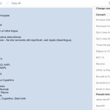 La parte delle “Conversioni” permette di gestire l’ordine delle righe (ascendente o discendente), aumentare o diminuire indentature e rientri, sostituire tre singoli punti di sospensione con il segno unico dei tre puntini di sospensione, convertire il testo in Rot 13 e convertirlo di nuovo in testo normale (il ROT 13 è un testo criptato: “dhrfgb è ha rfrzcvb qv EBG 13”), l’utilissima conversione da Html a testo semplice, la gestione degli spazi e delle altre notazioni con il simbolo % negli Url, la conversione da Emoji e Symbols a descrizione degli stessi basata sulla lingua selezionata dal sistema.