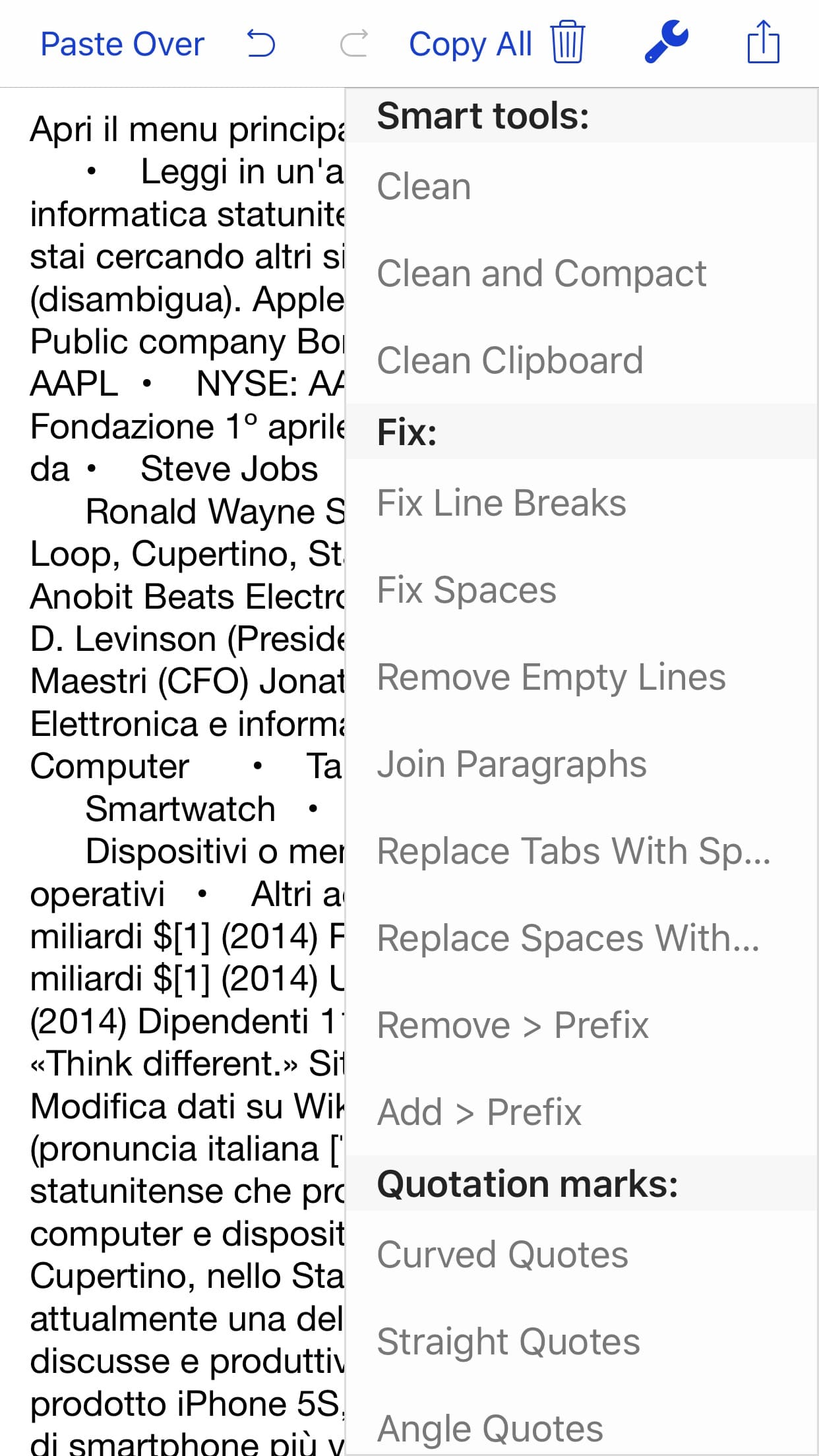 All’apparenza Clean Text sembra una app piuttosto semplice: nella versione per iPad (ma i comandi sono analoghi anche in quella per iPhone) presenta in alto pochi comandi: “Paste Over”, i classici simboli a forma di freccia di “annulla” e “ripeti”, e “Copy All”. A destra, oltre a un universale segno del cestino e un segno di esportazione (che richiama il tradizionale menu di Apple con le app e i servizi con le quali è possibile interagire), c’è il simbolo della chiave inglese che, una volta premuto, fa comparire un pannello sulla sinistra con una serie di comandi (indicati in inglese).