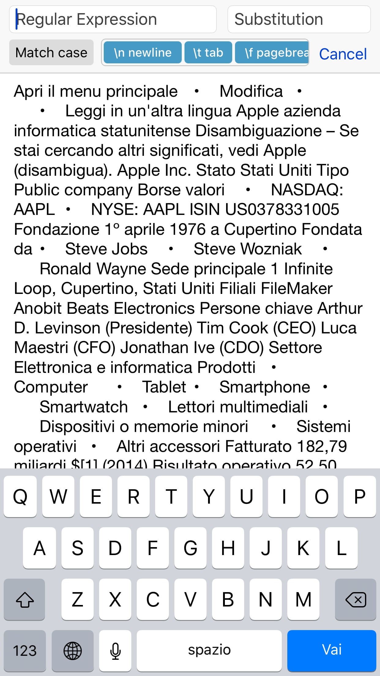 Lo abbiamo convertito da Html a testo semplice portandolo a 72mila caratteri in un colpo solo e rendendolo non soltanto facilmente usabile ma anche ben impaginato e ben utilizzabile. C’erano comunque anche molte altre cose che abbiamo potuto fare: manipolazioni per eliminare doppi spazi, righe vuote inutili, trovare e sostituire alcune parole, eliminare tutti i richiami alle citazioni al piede della pagina di Wikipedia (i numeri tra parentesi quadra): cose che a mano avrebbero richiesto un lungo lavoro di editing con sempre la possibilità di errore ma che la potenza delle espressioni regolari e degli altri strumenti di manipolazione del testo presenti in questa piccola app hanno reso molto facile e veloce, oltre che complete.