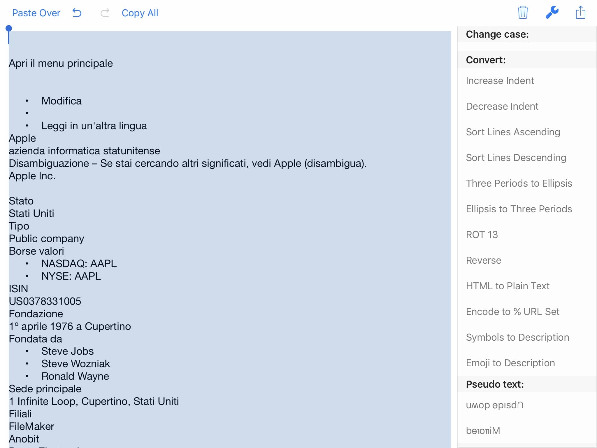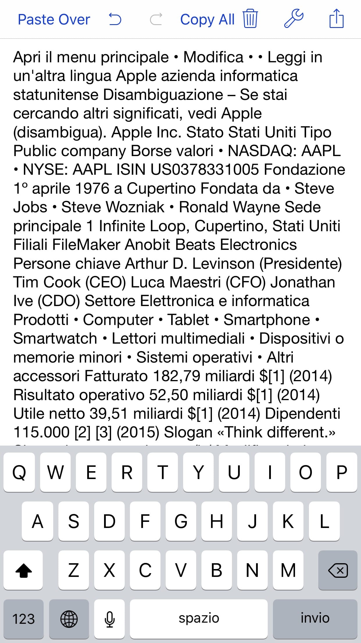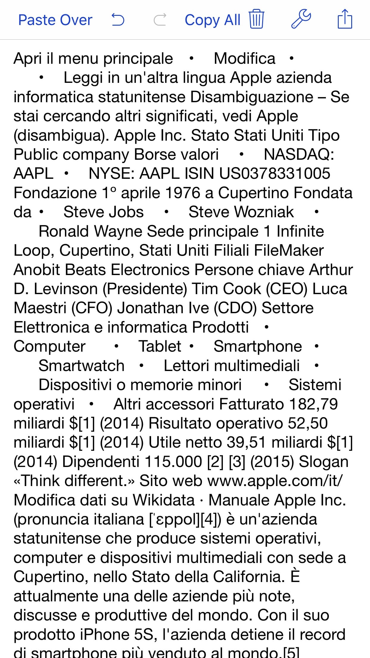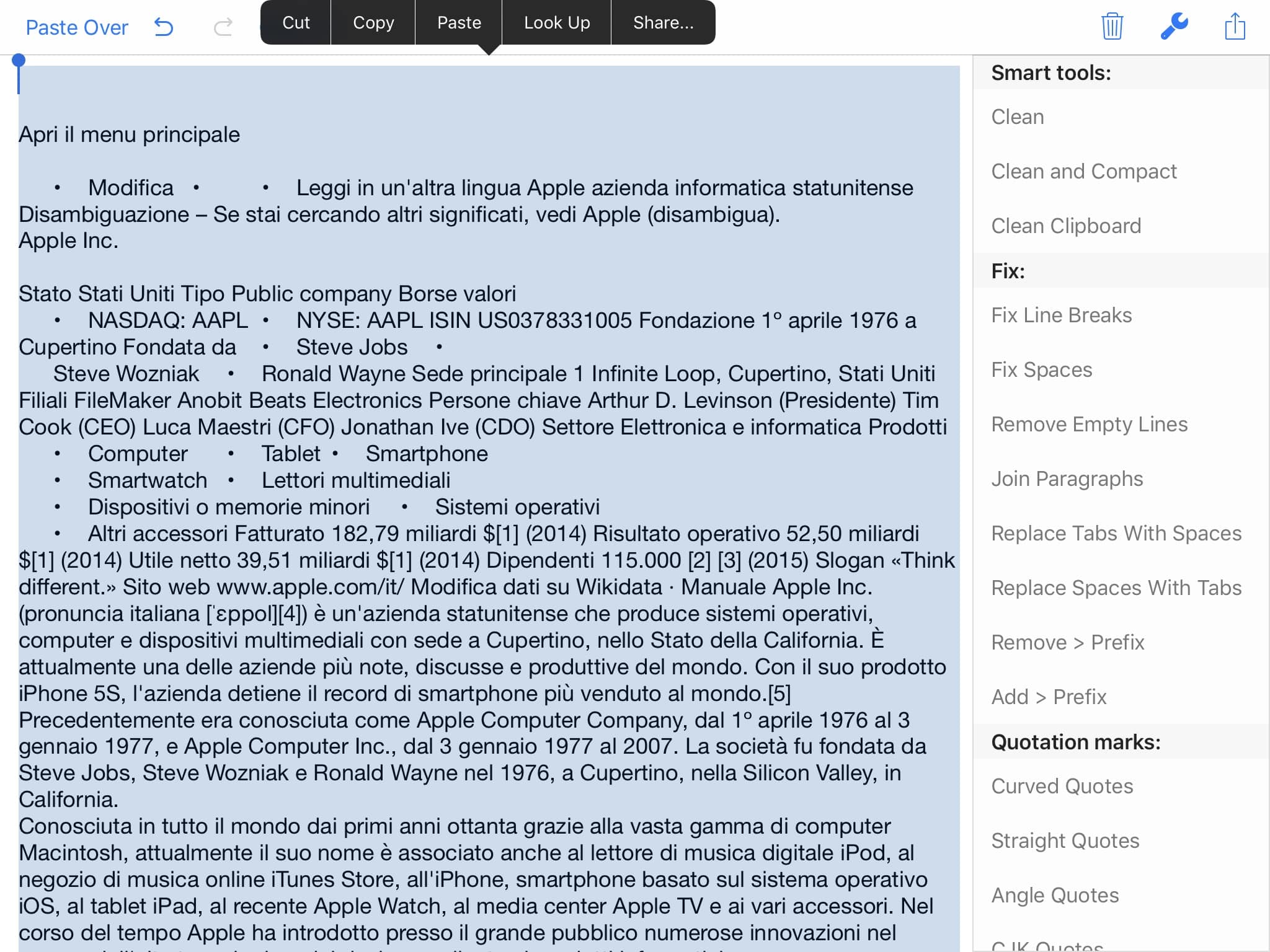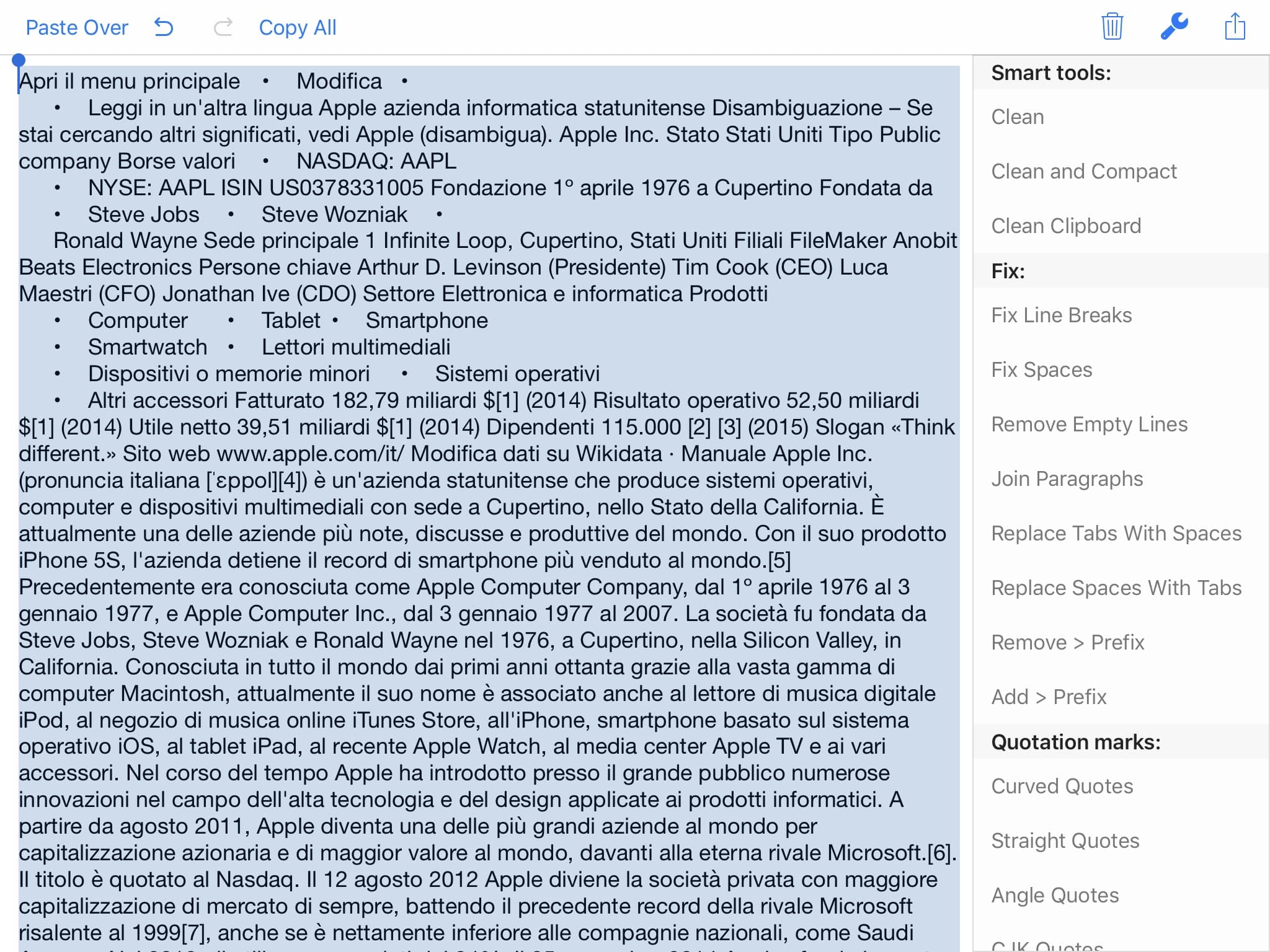 Abbiamo fatto un esperimento: da Safari abbiamo selezionato la pagina italiana di Wikipedia dedicata ad Apple e abbiamo estratto il codice html con l’utilissimo coltellino svizzero Workflow e l’abbiamo selezionato per poi incollarlo dentro Clean Text. A questo punto abbiamo avuto a disposizione uno strumento potentissimo per gestire un testo di 235mila caratteri spazi inclusi.