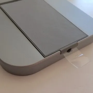 La parte superiore della basetta ha la scanalatura per il passaggio del cavo che scende dall’elemento verticale una volta piazzato il pod e l’inserimento è immediato. L’ultimo passaggio prevede il montaggio dello sportellino posteriore che andrà a coprire il cavetto e che è realizzato con un materiale plastico leggermente più scuro e con una finitura superficiale di tipo “pelle”: la texture è esteticamente piacevole e stacca con la superficie alluminio rende l’insieme ancora coerente.