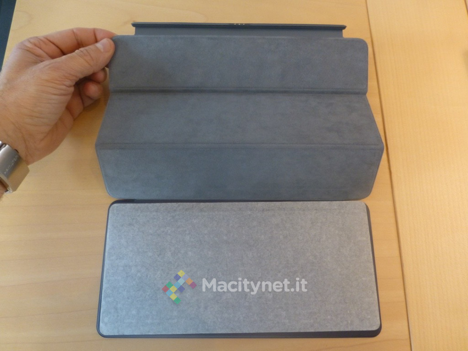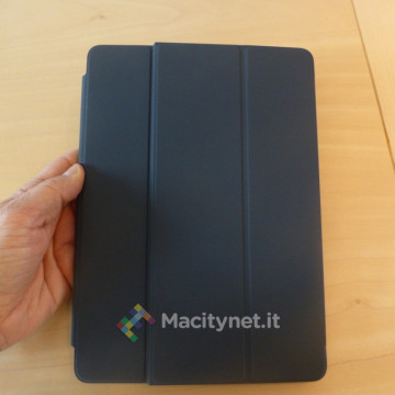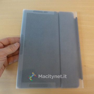 Il meccanismo di apertura rimane sempre un po’ convoluto perché le parti che la compongono sono i tre rettangoli pieghevoli e il pezzo maggiore che tiene con sé i tasti. C’è un’unica posizione utilizzabile, vale a dire quella che deriva dalla piega che permette ai pezzi di agganciarsi all’iPad nel punto della connessione della Smart Connector nel solco della tastiera. Questo vuol dire che l’inclinazione è unica: se si stacca l’aggancio del bordo della cover da quello della tastiera, pur mantenendo il primo attaccato allo Smart Connector dell’iPad, si perde la connessione.