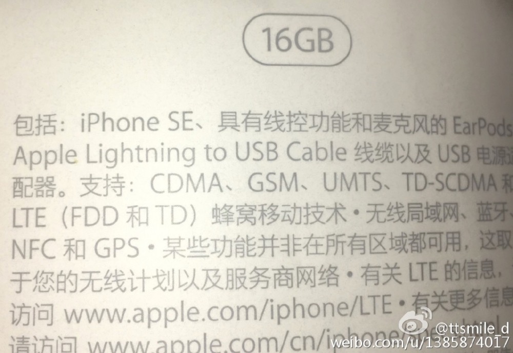Direttamente da un account cinese Weibo, in foto un particolare della presunta scatola di iPhone SE: al di là delle scritte in lingua cinese, l’immagine in calce sembra confermare il nome del dispositivo, e la disponibilità della variante da 16 GB.