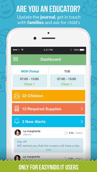 Un diario di bordo dei bambini sempre aggiornato e a disposizione, un sistema per gestire la burocrazia e le comunicazioni con i genitori in modo immediato e condividere con maestre e famiglie le novità legate alle attività della scuola. Tutto questo, in un’app, Easynido, e un sistema per la gestione delle scuole materne e degli asili nido che ha come obiettivo quello di semplificare il lavoro, velocizzare le attività degli educatori e ottimizzare le comunicazioni esterne.