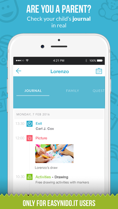 L’app offre ai genitori la possibilità di consultare in tempo reale il diario di bordo dei bambini, visualizzare le foto e i video condivisi dalle insegnanti e scambiare messaggi in modo semplice con gli educatori.
