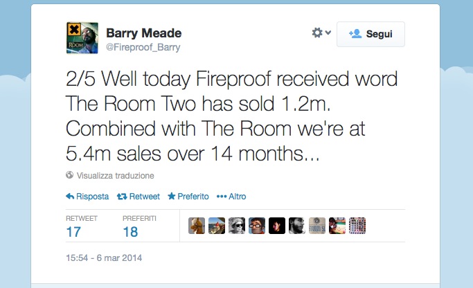 Quasi cinque milioni e mezzo di copie vendute e senza investire in promozione. Sono i risultati della serie The Room, comunicati con un tweet dal cofondatore della software house Fireproof Games e direttore del progetto Barry Meade. «Oggi – ha scritto su Twitter Meade – Firoproof ha ricevuto la notizia che The Room 2 ha venduto 1,2 milioni di copie. Se messe insieme a quanto venduto dal primo capitolo di The Room abbiamo raggiunto 5,4 milioni di copie vendute in 14 mesi». Con orgoglio e non senza lanciare una frecciata, Meade sottolinea come il risultato sia stato raggiunto «senza spendere un soldo in marketing, PR, analisi o analisti». Mean poi ha proseguito spiegando come «Non avevamo alcuna esperienza sul mobile, ce la siamo fatta col passare del tempo, abbiamo creduto nel passaparola dei giocatori».