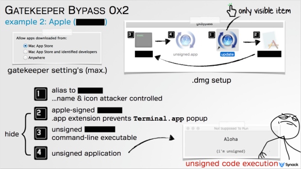 Wardle ha così recuperato sul web il codice di un noto e diffuso software del mondo Mac, già firmato e autorizzato da Cupertino. All’interno della stessa cartella ha poi inserito un altro piccolo programma, creando così una immagine disco pronta all’uso. Anche quanto Gatekeeper è in funzione e impostato al massimo della sicurezza, autorizza il pacchetto bomba perché riconosce il software già firmato da Apple. In fase di esecuzione il programma malevolo incluso nel pacchetto entra in funzione e può così scaricare spyware, botnet, trojan e qualsiasi altro tipo di malware l’attaccante desideri.