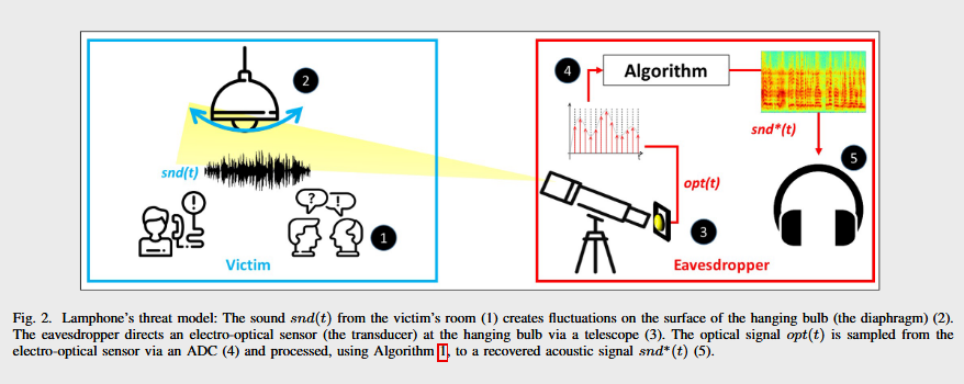 La tecnica, denominata Lamphone, si basa sul principio che gli oggetti vibrano quando le onde sonore colpiscono le loro superfici. Quando questo avviene con le lampadine, riferiscono i ricercatori, le microvibrazioni creano piccoli sfarfallii nell’emissione della luce; tenendo conto di questo e usando potenti sensori, è a quanto pare possibile registrare le variazioni luminose e con tecniche di ingegneria inversa ricavare le onde sonore che colpiscono la superficie della lampadina.
