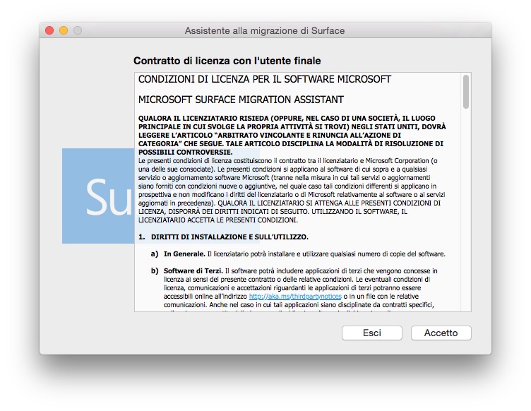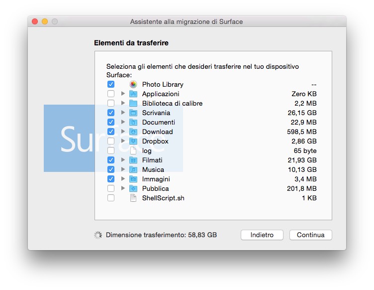 Le funzioni naturalmente non cambiano: basta scaricarla e avviarla per poter trasferire con una procedura guidata documenti, foto, film e musica conservati sul Mac sul nuovo e fiammante Surface. Come mostrano le schermate che riportiamo in questo articolo migrare da Mac a Surface risulta semplificato: l’utente può togliere o rimuovere il segno di spunta sugli elementi da trasferire che oltre a Photo Library, Documenti, Filmati e Musica, includono anche gli elementi della Scrivania del Mac, Immagini, la cartella Dropbox, i Download e altro ancora. Per ogni elemento viene riportata la dimensione che occupa in memoria, mentre in basso è indicato il peso complessivo di tutti gli elementi selezionati per il trasferimento.