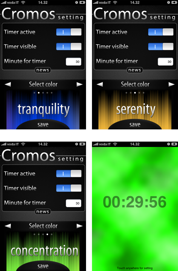 Una volta lanciato Cromos è sufficiente impostare il tempo desiderato, lo stato emozionale da indurre, infine rilassarsi osservando lo schermo del nostro tascabile. Durante la seduta è anche possibile ascoltare la propria musica preferita. Proposto su App Store a 79 centesimi.