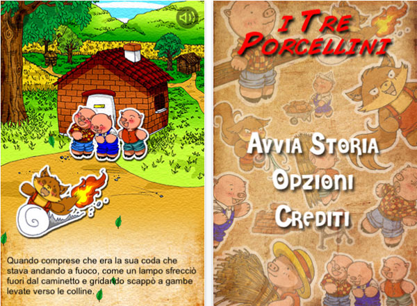 iPhone e touch hanno il potere di intrattenere i più piccoli quando la situazione si fa critica: ora oltre alle app e agli infiniti giochi possiamo sfoderare anche una nuova fiaba interattiva. Con I Tre Porcellini abbiamo a portata di mano la classica favola con personaggi e scenari disegnati a mano, con grafica e tratti perfetti per i bimbi. Il dettaglio interessante è che oltre ad osservare le vicende su schermo i piccoli possono toccare e trascinare i personaggi sullo schermo touch, ognuno infatti è una sorta di sticker removibile.