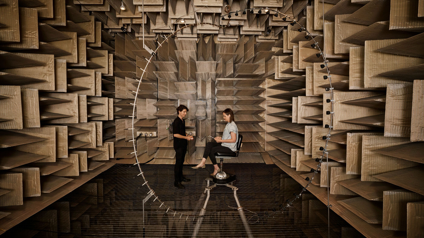 Un altro elemento centrale è la camera anecoica, una stanza dentro la stanza isolata dal resto dell’edificio. Pavimento, pareti e soffitto sono ricoperti di pannelli che assorbono completamente ogni onda sonora: qui non esistono riflessi, un battito di mani o una voce si spengono all’istante. Per muoversi si cammina su una griglia sospesa, perché anche il pavimento è riempito di materiale assorbente. È uno spazio surreale, quasi alieno, ma essenziale per il lavoro degli ingegneri.