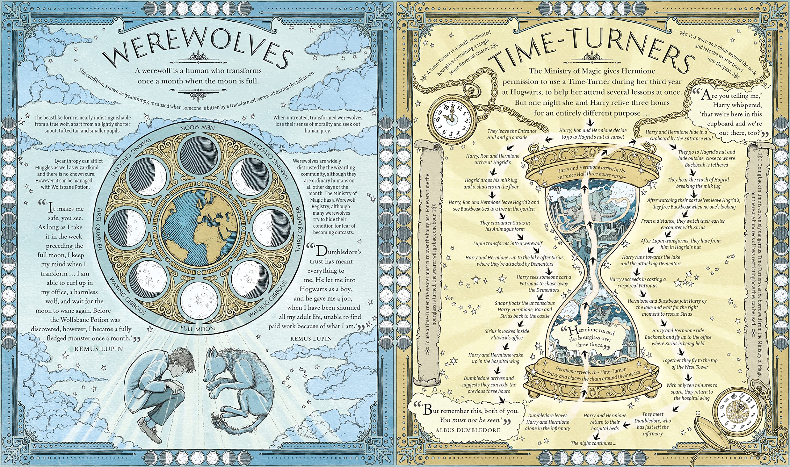 C’è un’intera pagina dedicata al funzionamento della GiraTempo, il magico oggetto protagonista del terzo capitolo della saga e dello spettacolo teatrale che racconta le avventure del magico trio 19 anni dopo la caduta di Voldemort, e una che invece ci dice tutto quel che c’è da sapere sui lupi mannari. Un’altra infografica a due pagine mostra i vari piani del castello di Hogwarts, altre tavole invece ci dicono qualcosa in più sugli abiti dei maghi e sui negozi principali di Diagon Alley, compreso il più amato di tutti: i Tiri Vispi Weasley.