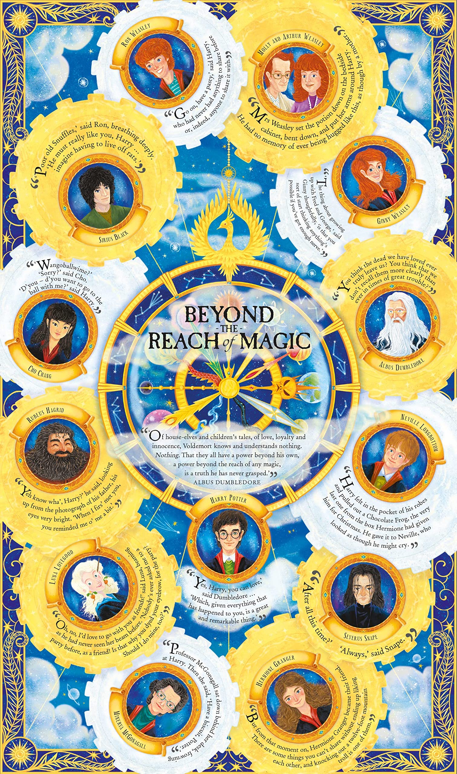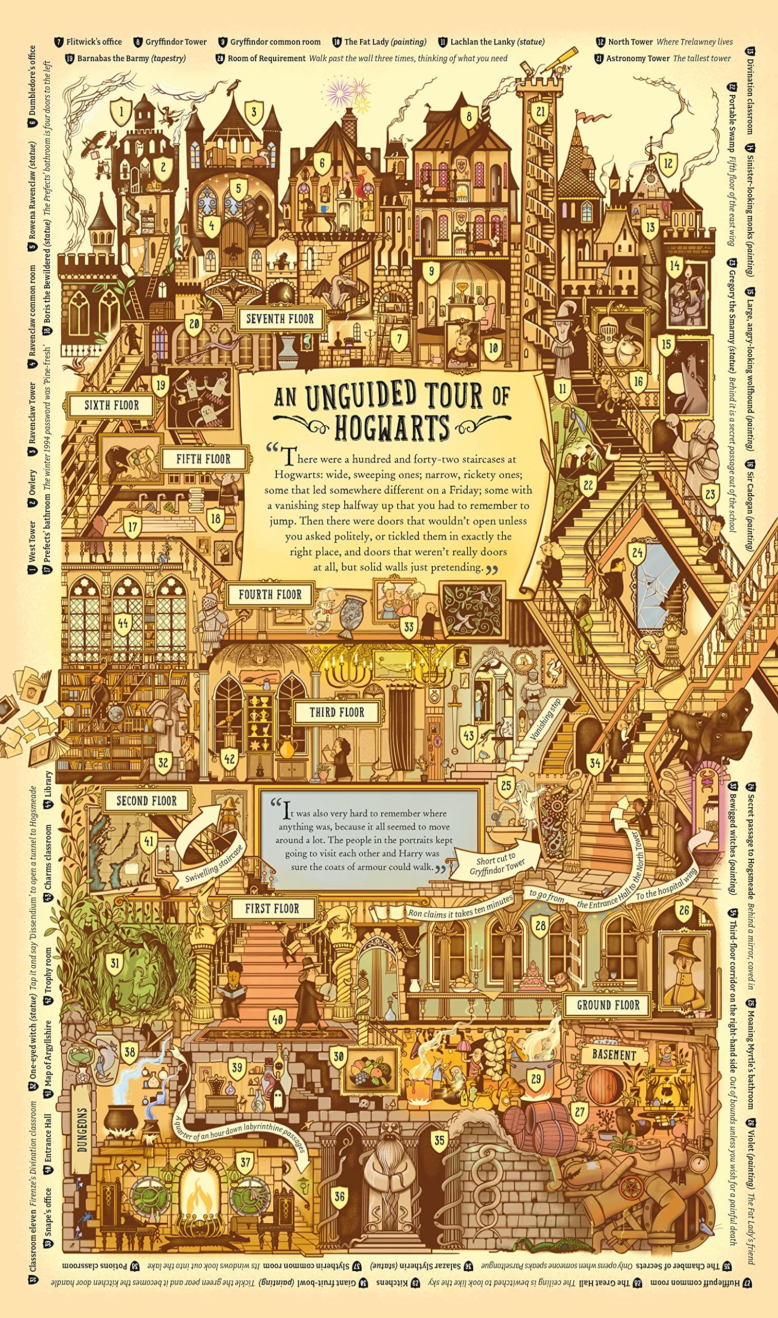 Si tratta infatti di un compendio illustrato in cui è possibile rivivere i sette anni a Hogwarts attraverso mappe, elenchi, guide, linee del tempo, infografiche e tanto altro ancora. Uno scrigno – come suggerisce la copertina stessa, caratterizzata da un baule da cui sprizzano fuori gli oggetti magici più chiacchierati della saga – di informazioni e curiosità sui personaggi, i luoghi, le piante, i cibi, gli animali e gli oggetti che i lettori incontrano durante la lettura, qui però presentati con una efficace rappresentazione visiva.