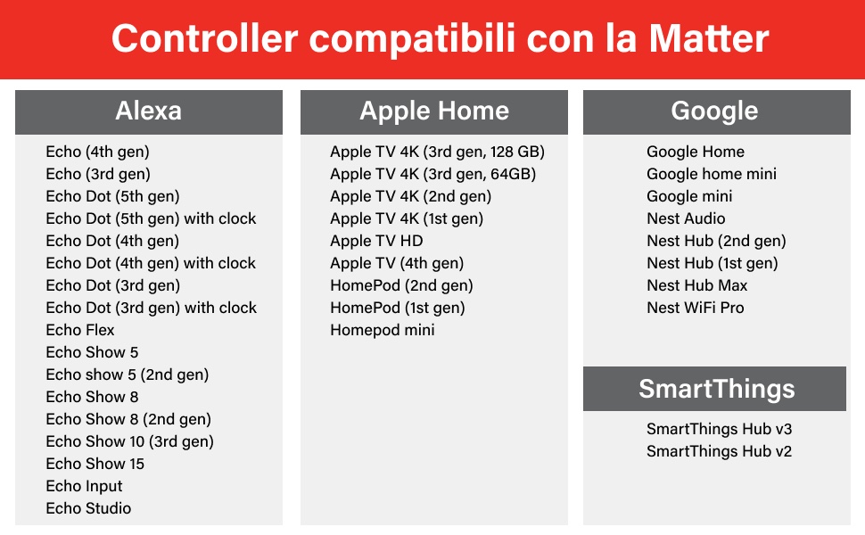 La sua particolarità è che è facilmente tramite comando vocale o app mobile con Amazon Alexa, Google Assistant, Apple HomeKit e Samsung SmartThings. Basta avere il Wi-Fi a 2,4 GHz e uno dei dispositivi che vedete qui sotto in funzione di controller.