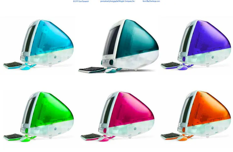 Dopo il primo modello con PowerPC G3 a 233 MHz colore “bondi blue” (dal nome di una spiaggia australiana con l’acqua di quel colore), arrivarono l’iMac DV (per Video Digitale), una versione con riverstimento color grafite e quelle con nuove plastiche colorate, tra le quali: Ruby (rosso), Sage (verde), Snow (bianco) e Graphite (grigio). Poi il “Blue Dalmatian”, “Flower Power” e poi ancora “Indigo” e “Snow”.