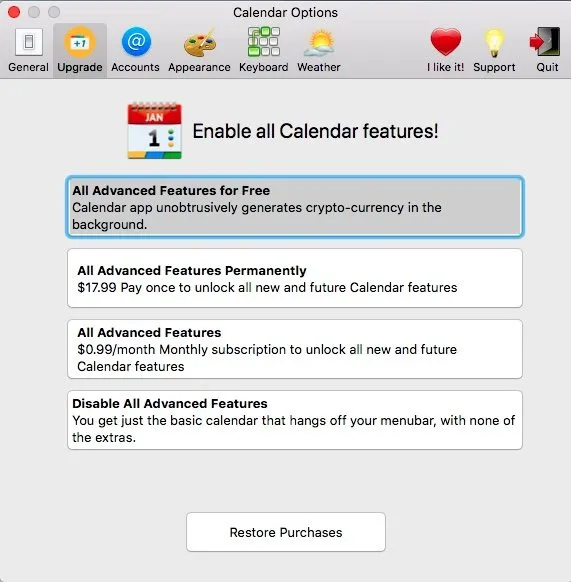 Qualche giorno addietro nel mondo Apple si è molto parlato di Calendar 2, applicazione approvata da Apple per la distribuzione sul Mac App Store nonostante un meccanismo integrato dallo sviluppatore dell’app per fare soldi. L’applicazione (ora rimossa dal Mac App Store) consentiva di sbloccare funzionalità “premium” a pagamento oppure in cambio dell’utilizzo di risorse del computer dell’utente, un sistema sfruttato per il mining di Monero, la moneta virtuale alternativa a Bitcoin diventata negli ultimi tempi molto popolare.