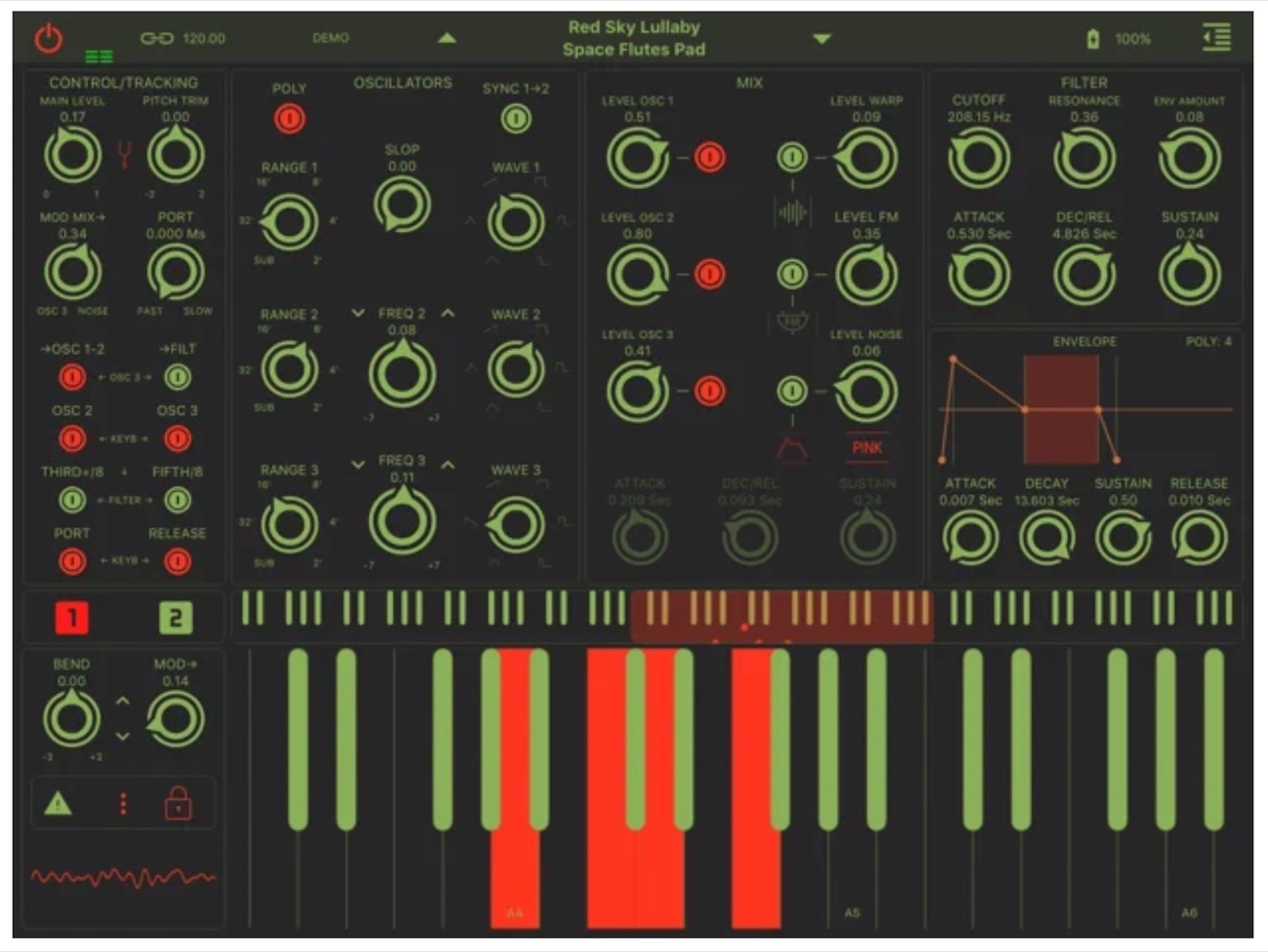 L’app realizzata dalla Apesoft di Alessandro Petrolati dispone di una «immensa capacità sonora» ed è stata realizzata nella solita forma con cui lo sviluppatore ha realizzato altre applicazioni di questo genere, includendo quindi tutti gli strumenti che ci si aspetta da un’app per strumenti musicali di prim’ordine. Tra le sue caratteristiche di punta troviamo il supporto MIDI Audiobus 3, la possibilità di condividere preset e campioni tra app e AUv3, il modulo FM, 3 oscillatori, il tracciamento e il controllo della tastiera, la possibilità di usarla in mono o in 16 voci polifoniche e la scala filtro VCF 24dB per ottava.