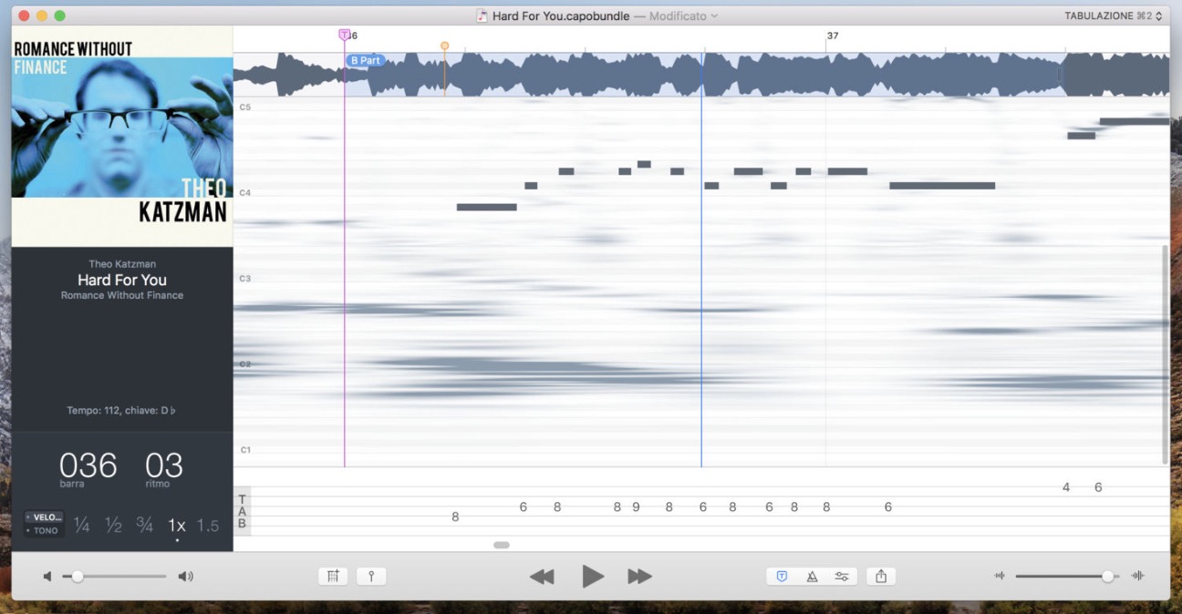 Con il software Capo per Mac è possibile eseguire in loop una sezione, modificando in modo accurato inizio e fine delle ripetizioni e salvare i progetti in file. Il brano è mostrato sotto forma di spettrogramma, permettendo di visualizzare a colpo d’occhio tutto ciò che viene suonato o evidenziare alcune parti. I suoni che ci interessano possono essere riportati sotto forma di tablatura consentendo la veloce trascrizione di parti. L’applicazione è in grado di rivelare e inserire i nomi degli accordi, offrendo la possibilità di intervenire manualmente dove gli algoritmi del software dovessero sbagliare.