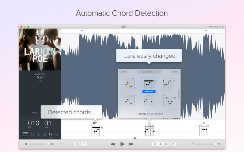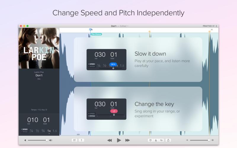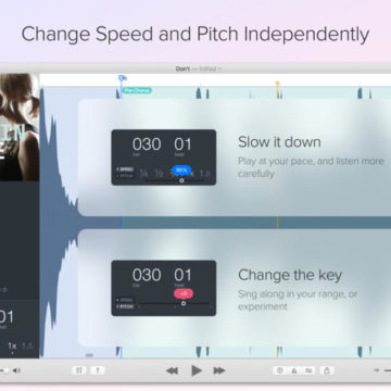 L’app per iOS consente di scegliere un brano dalla libreria iTunes, analizzarlo determinado tempo e tonalità, riprodurlo a varie velocità (senza alterare il pitch), consentendo di comprendere i passaggi più complessi e ricostruire anche gli assoli più veloci.