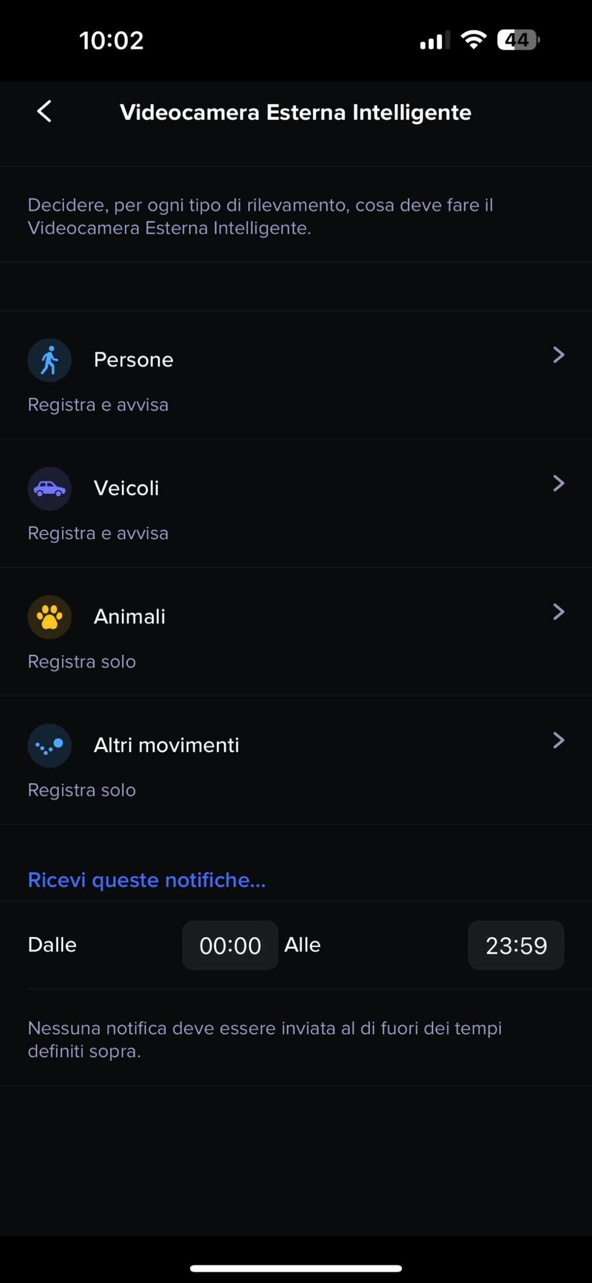 - Impostare la Videocamera Esterna Intelligente per attivare il suo sistema di illuminazione nel caso in cui rilevi una persona o un’auto ma non un cane o un gatto;