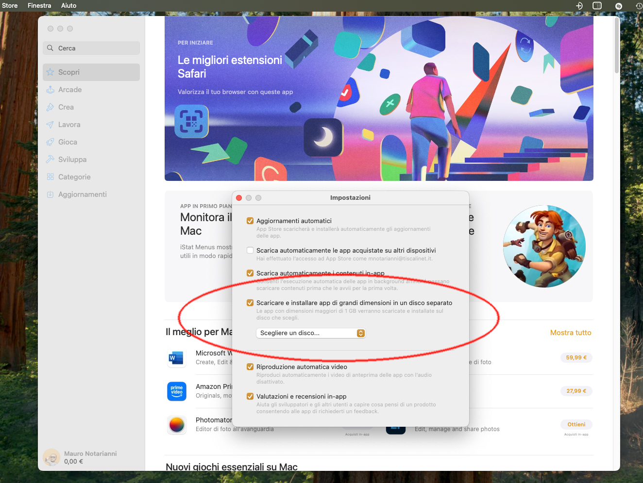 La Preferenza (richiamabile aprendo l’App Store e da qui il menu “App Store” e la voce “Impostazioni”) è valida solo per le app che “pesano” più di 1GB; dopo averla attivata è possibile indicare successivamente (al momento del download) il volume di destinazione per l’app “pesante”. Non ci sono opzioni (sarebbe stato utile chiedere cosa fare quando non è collegato il disco esterno o quale disco usare quando sono presenti più dischi) ma è ad ogni modo un piccolo passo avanti.