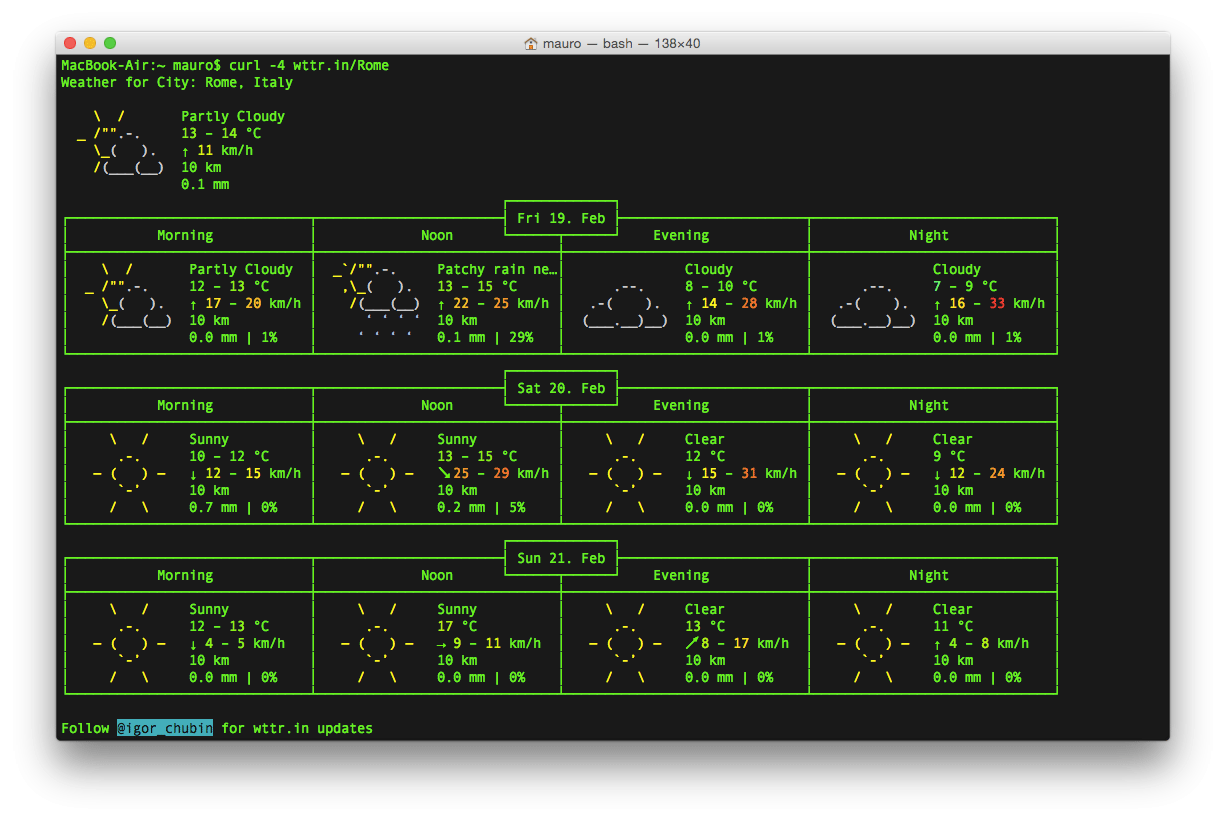 [highlight color=”yellow”]curl -4 wttr.in/nomecittà[/highlight]