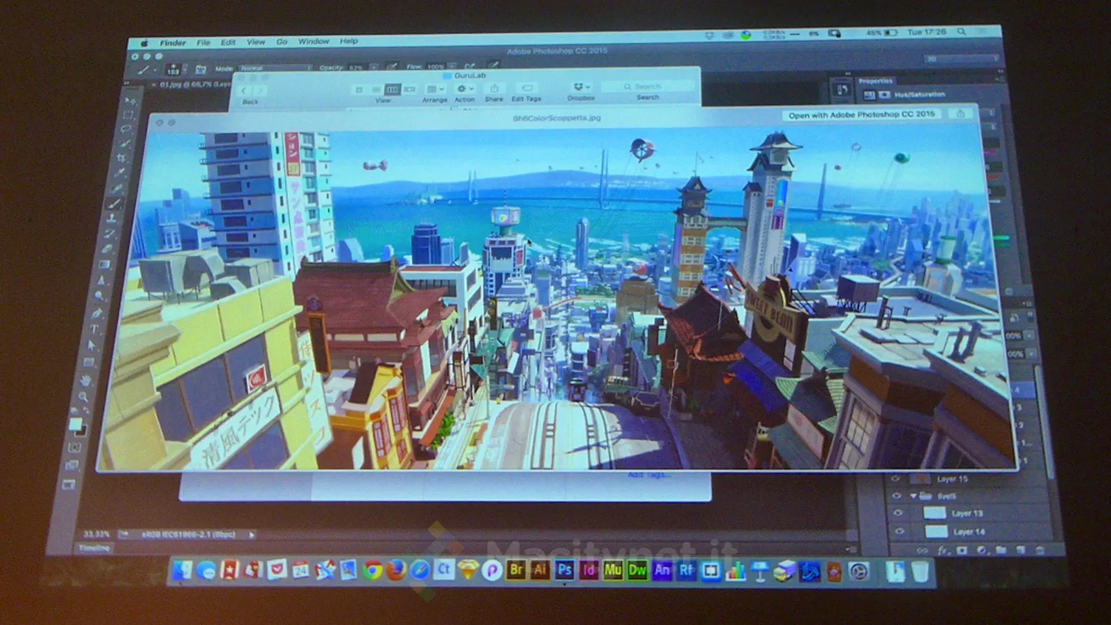 La professionalità e la magia della creazione di Andrea prendono poi vita sullo schermo di Photoshop che l’artista impiega esclusivamente su computer Mac con l’ausilio di una tavoletta grafica Wacom. In questo articolo riportiamo diverse fotografie e anche due video che Macitynet ha realizzato all’Adobe Creative MeetUp di Milano durante l’intervento di Andrea Scoppetta.