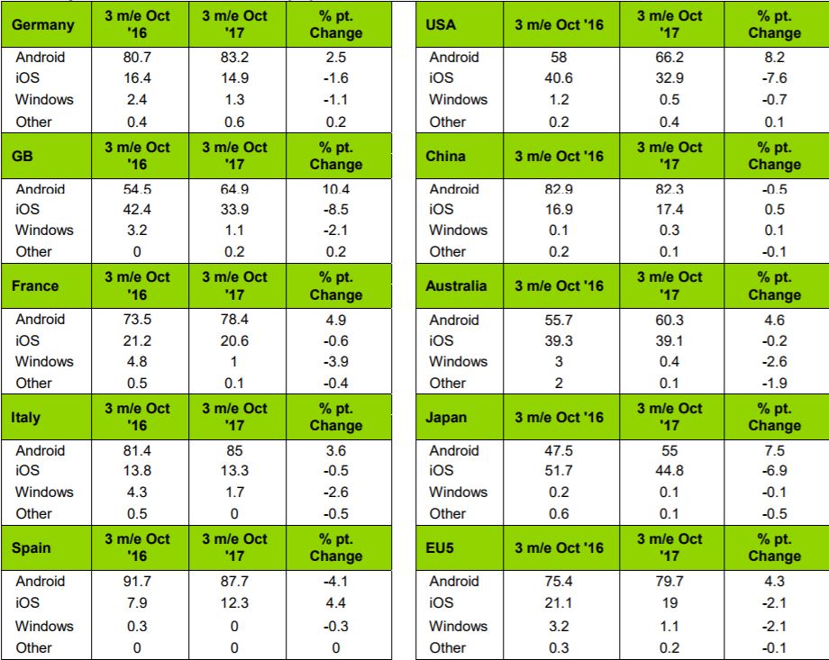 Sembra che l’attesa per iPhone X non abbia giovato alla quota di mercato iOS, che ha registrato, almeno in alcuni importanti paesi, come USA, Giappone e Regno Unito, importanti cali di percentuale. Anche in Italia, dove però il dato negativo è contenuto nell’ordine dello 0,5%, rispetto allo scorso anno e praticamente invariato rispetto alla rilevazione del trimestre scorso.
